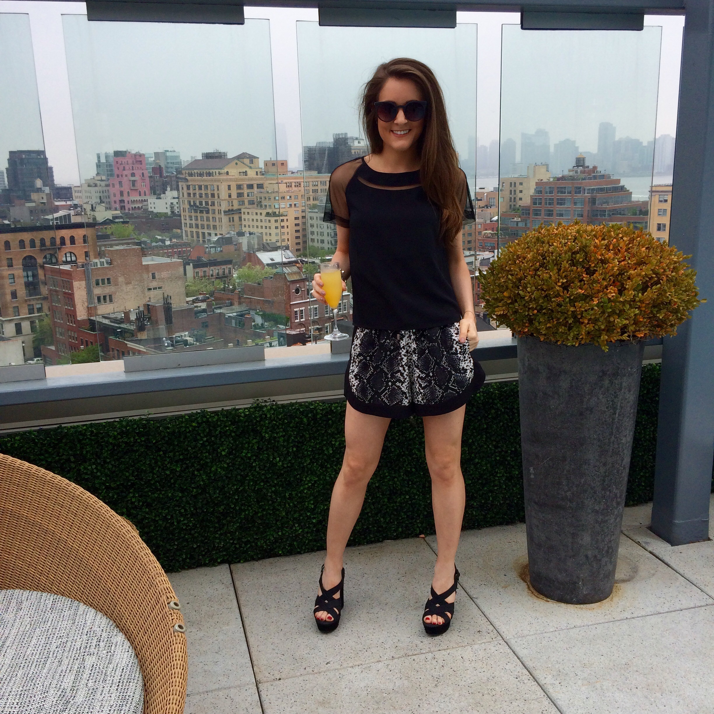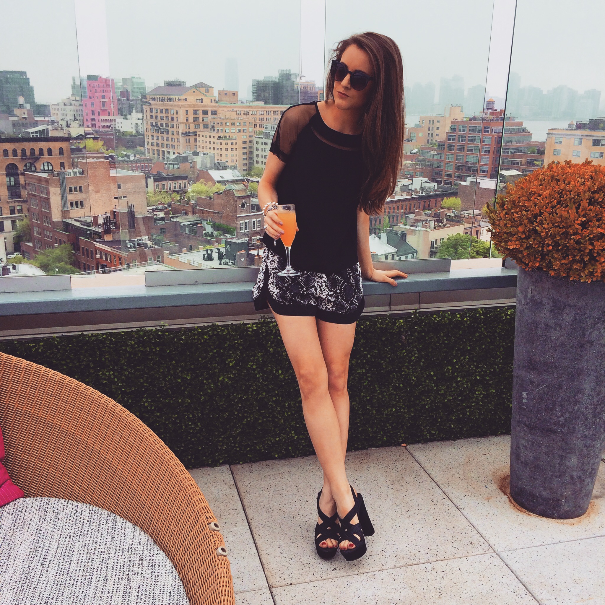 I am wearing the oh my sheerness” top with drawstring snake print shorts and black leather pumps. with summer swiftly approaching, this outfit is ideal because it is easy, breezy & able to pair with anything. Caroline’s boca maxi has a sexy slit up to the knee, paired here with those fun casual sneaks. we fit in juuuuuust right lounging lavishly at the top of the Gansevoort!